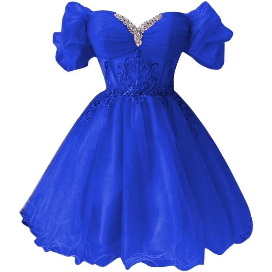 Youjiayi Off Shoulder Homecoming Dresses for Teens Sparkly Lace Tulle DAMA Dress for Quinceanera Beaded Short Prom Gown(Royal Blue)