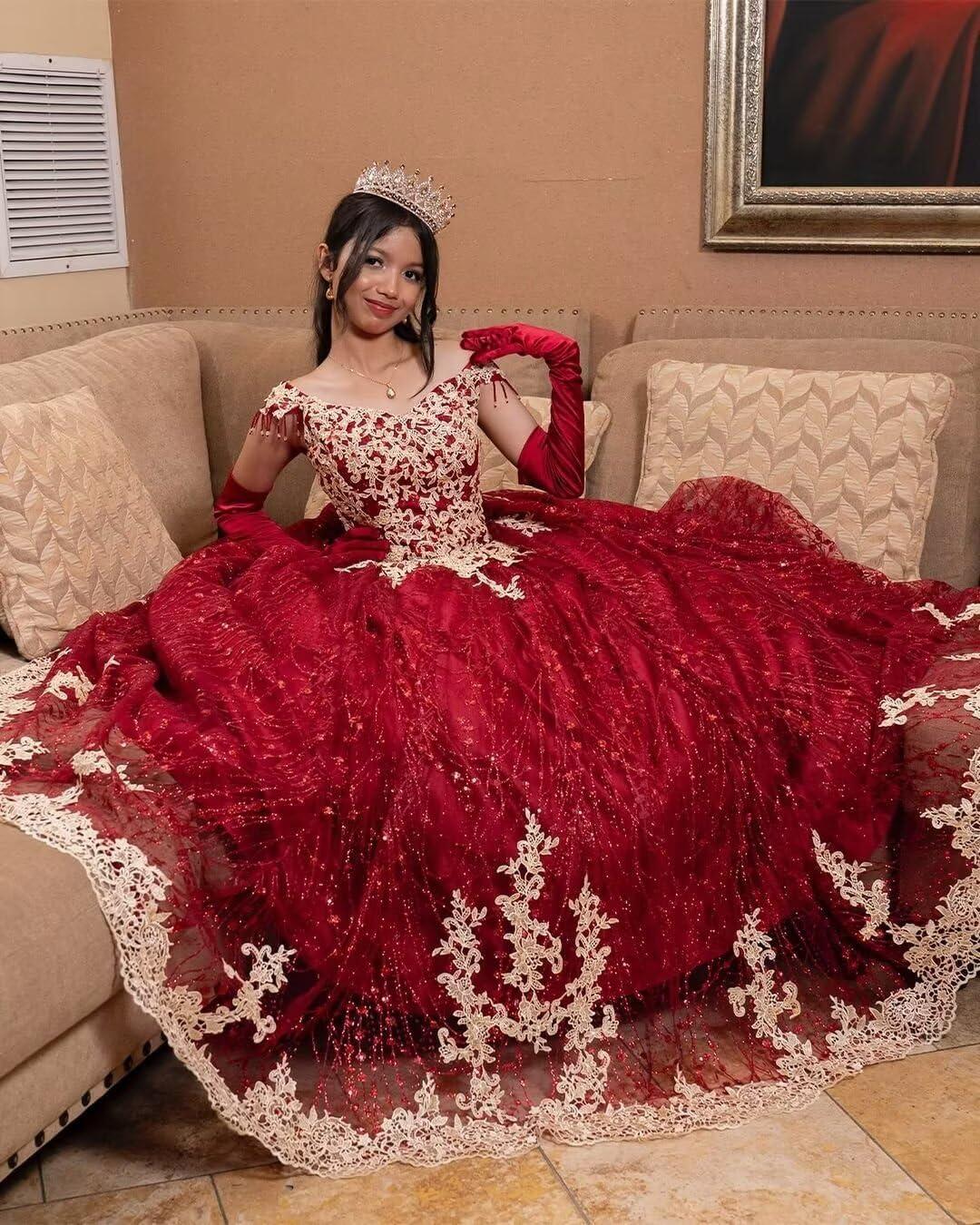 Youjiayi Sparkly Gold Appliques Quinceanera Dresses Puffy Tulle Sequin Ball Gown Off Shoulder Lace Beaded Sweet 16 Dresses(Magenta)